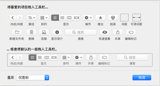 打开两个Finder窗口,平铺。打开⌈显示⌋ >⌈自定义工具栏⌋,将新建的NewFile.app图标拖到工具栏上。之后就可以直接在Finder窗口点击图标生成新的文件了,也可以使用spotlight使用NewFile新建文件。