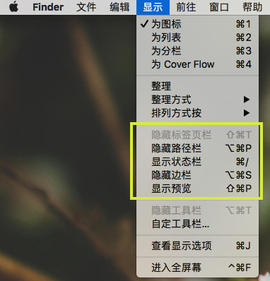 选择 ⌈显示⌋ > ⌈显示标签页栏⌋、⌈显示路径栏⌋、⌈显示边栏⌋、⌈显示预览⌋。